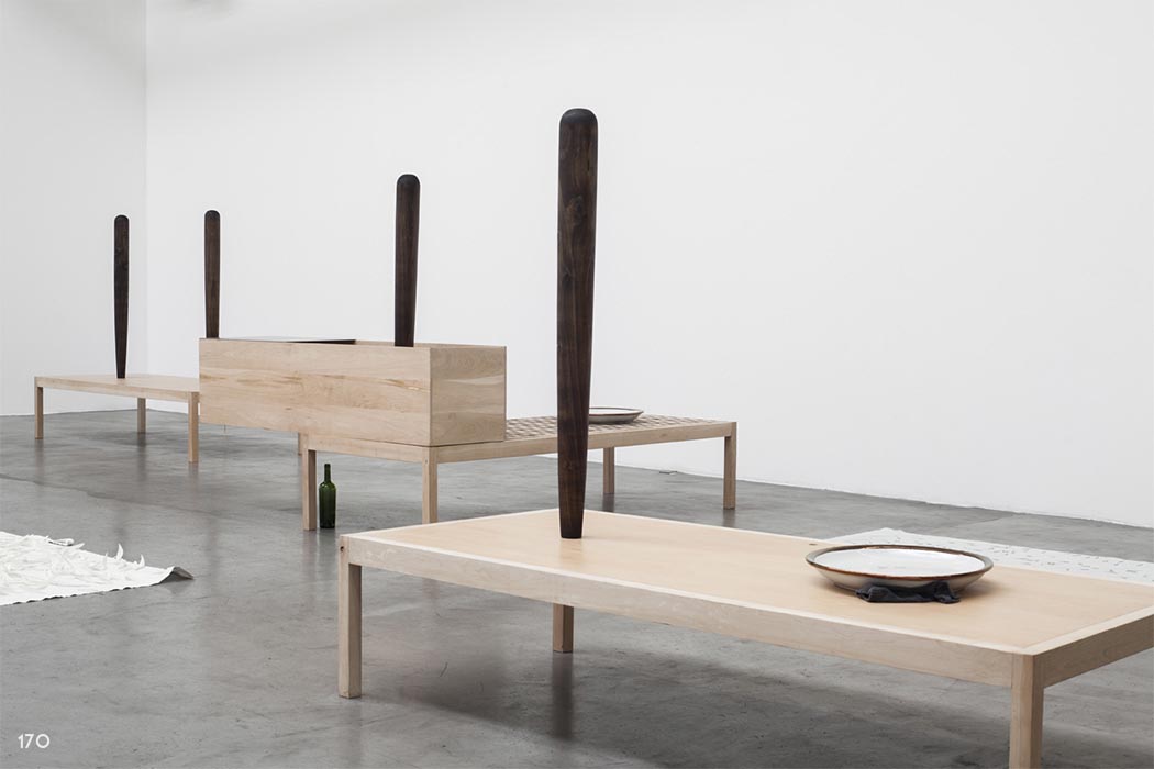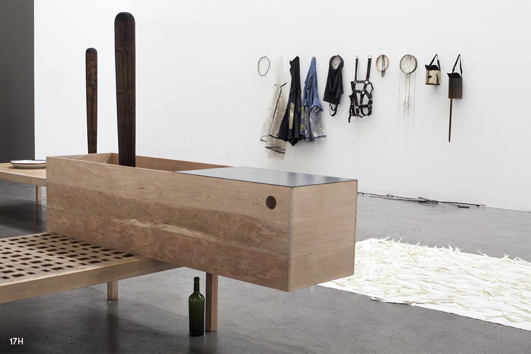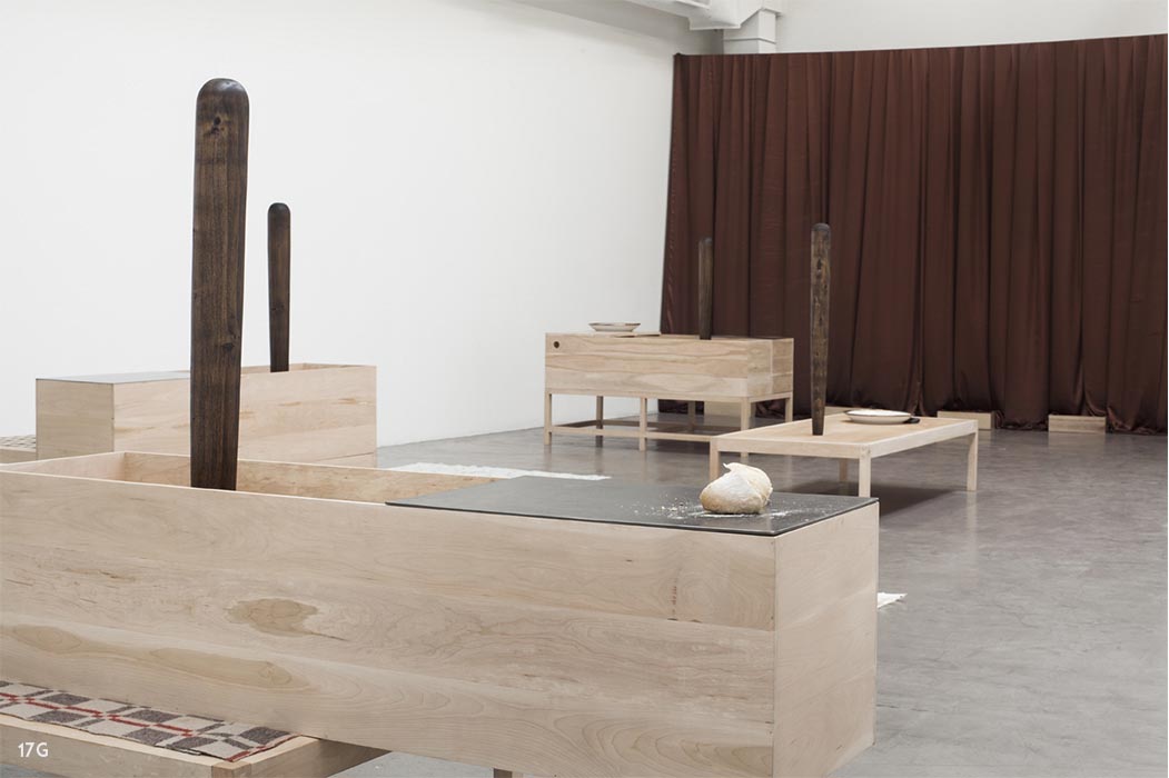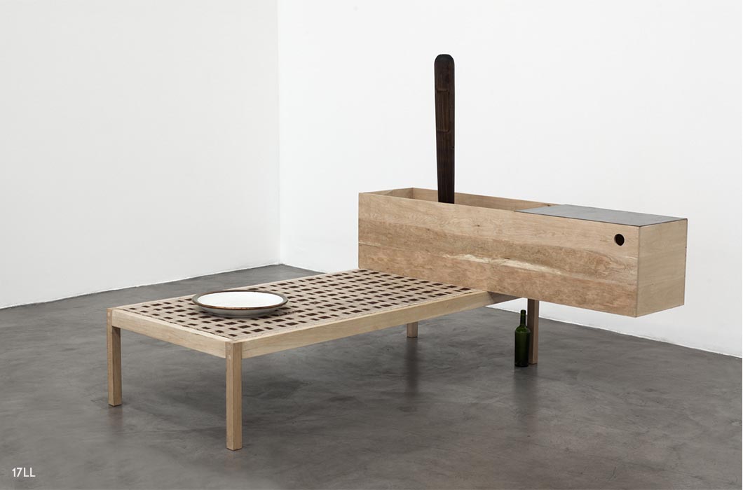 Madera, porcelana, frazada, pan, metal. Medidas 168 x 90 x 290 cm.