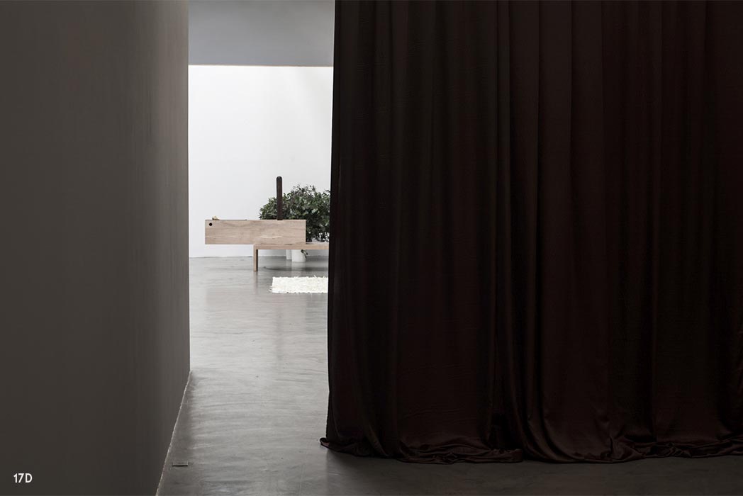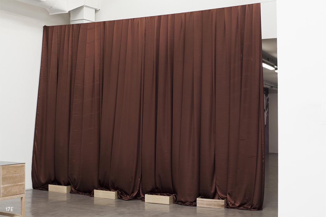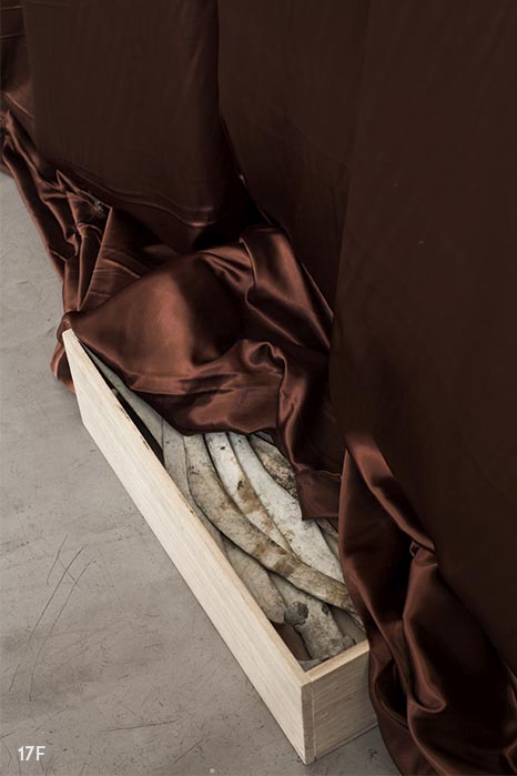 Sin título, de la serie COBRE MISERIA MIERDA. 2015/2016. Telón, cajas de madera, huesos.