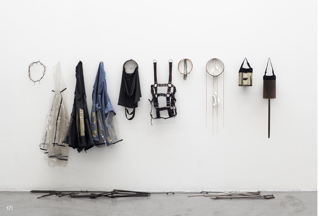 Madera, porcelana, metal, frazada, restos de indumentaria, nido de pájaros.