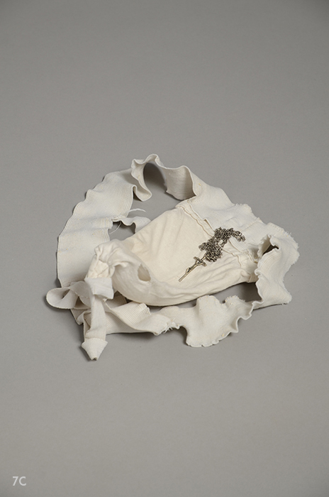 Escultura de piso: Protector de testículos, cadena, cruz de metal. Medidas: 25 cm x 25 cm x 10 cm.
