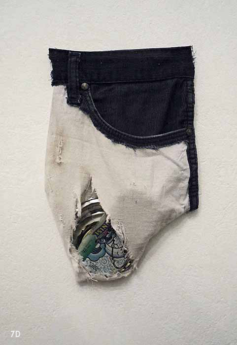Escultura de pared: bolsillo de pantalón, tapas de latas de conserva. Medidas: 20 x 27 cm.
